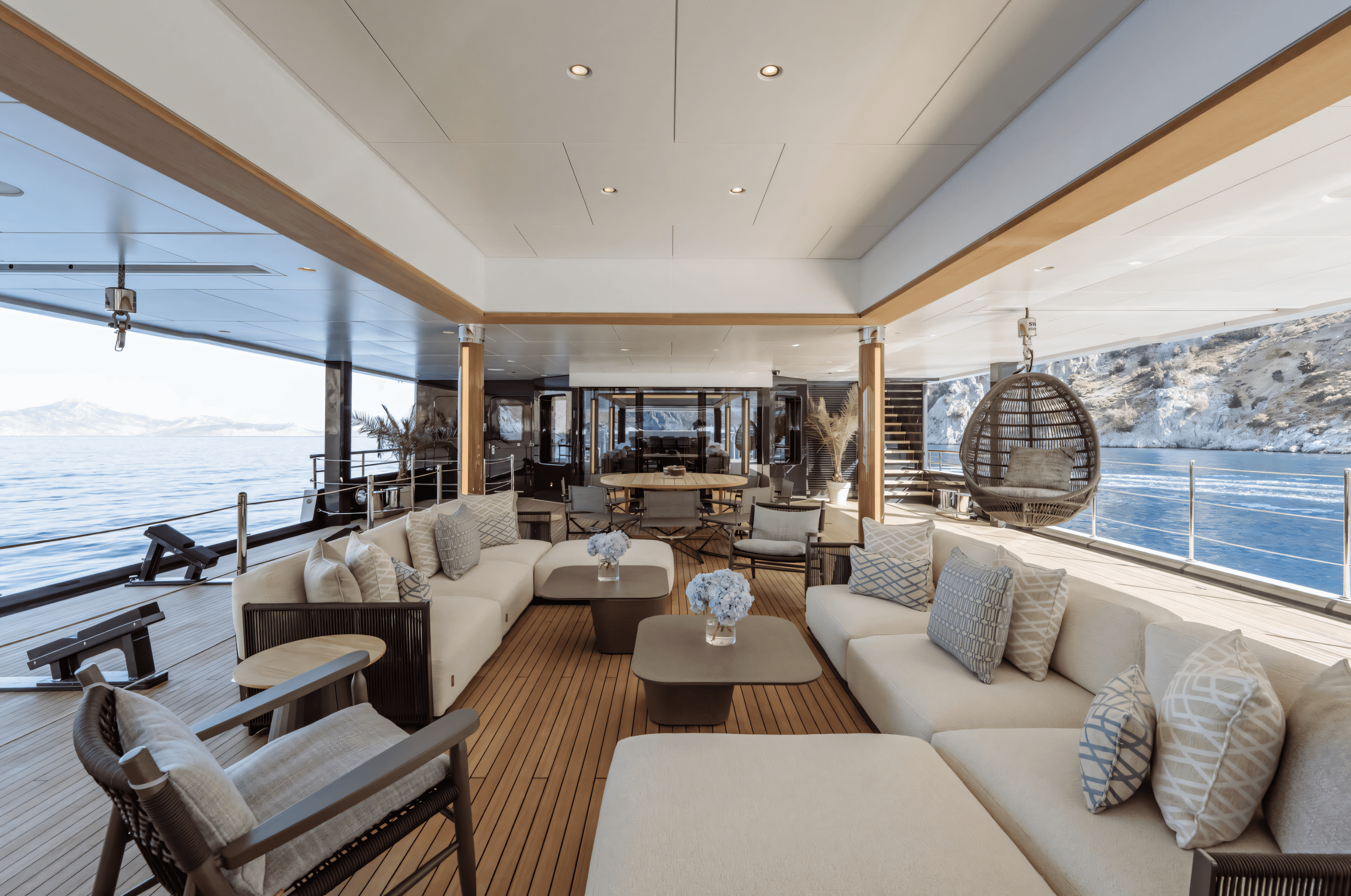 Inside, the atmosphere shifts from rugged adventure to laid-back elegance. Clean lines, natural materials, panoramic lounges, and private retreats create a level of comfort normally found on far larger yachts.