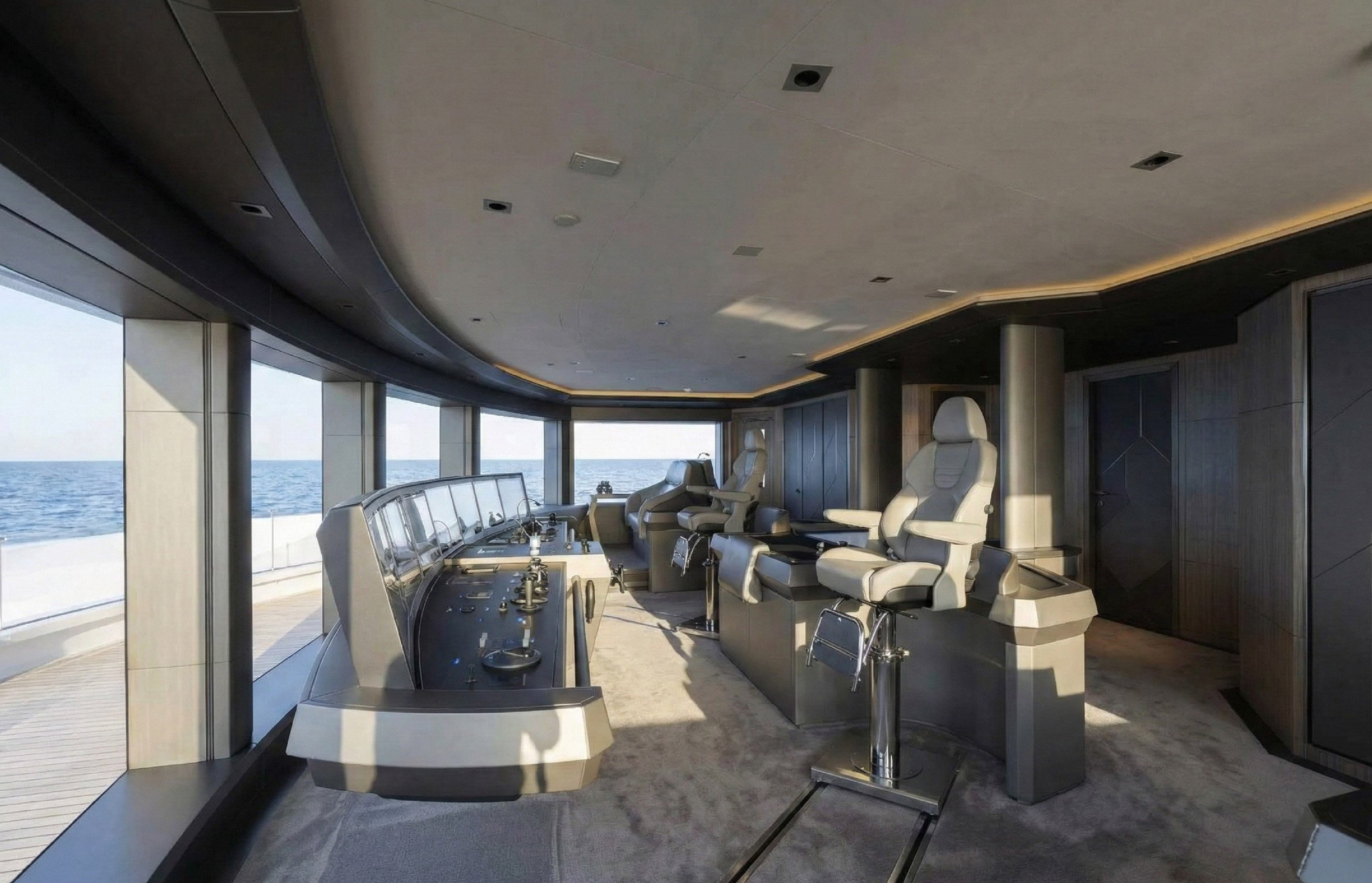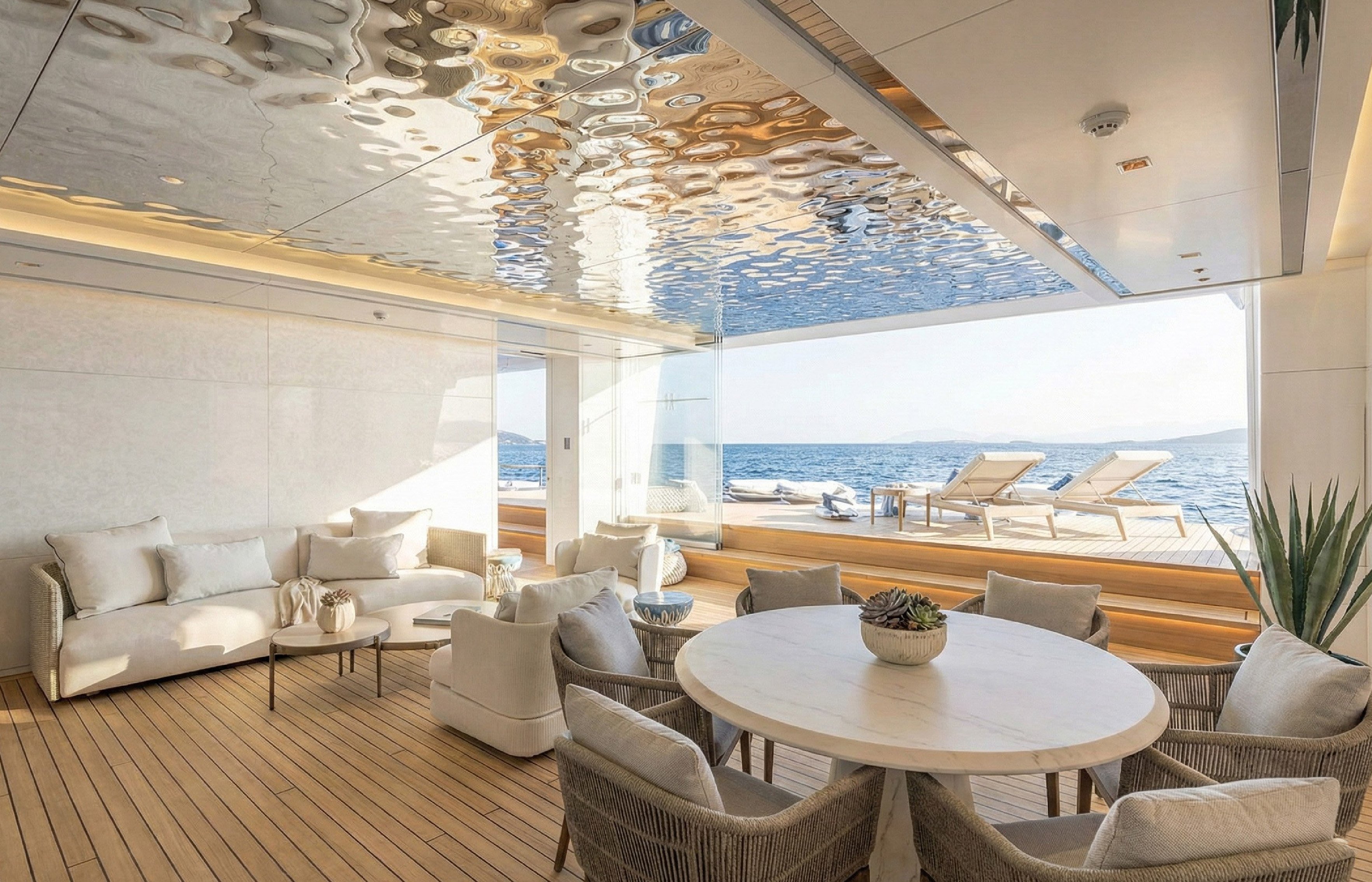 The transformation replaced the yacht's boxy profile with sculptural curves and dramatically increased natural light by expanding window area from 220 square meters to 392, with many floor-to-ceiling panes. Andrew Langton described the new interior as “relaxed, but still with a little bit of show”.