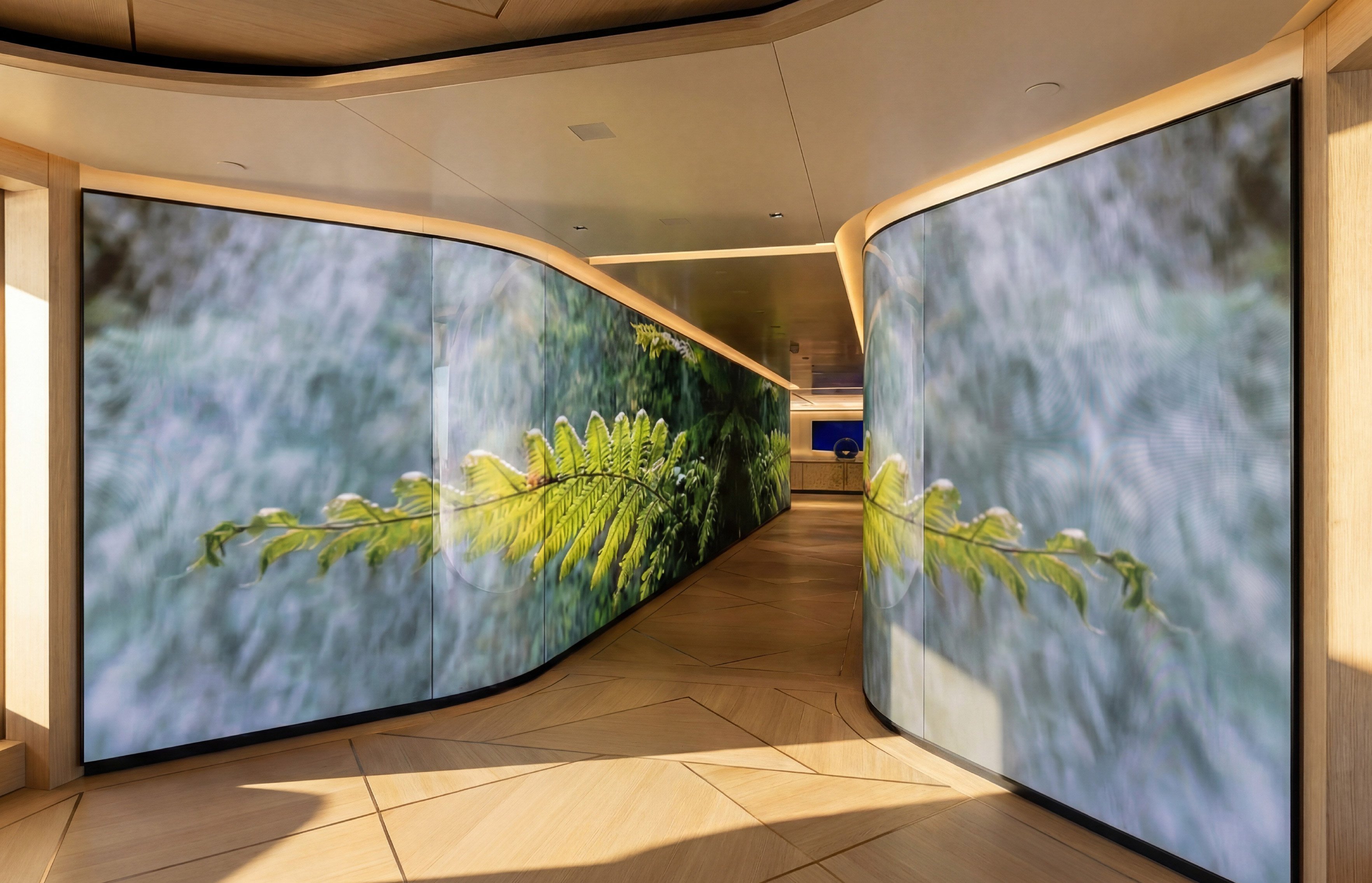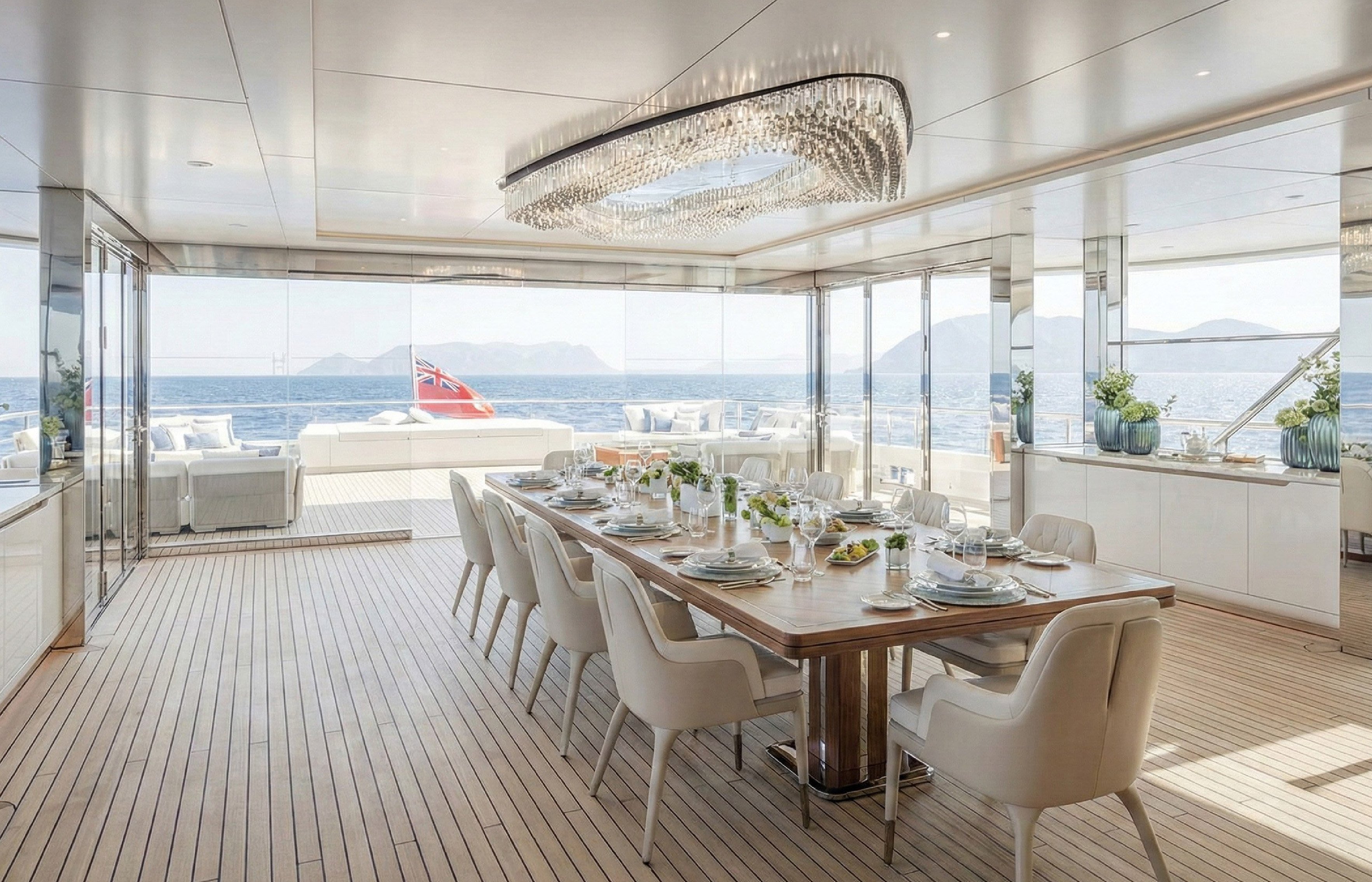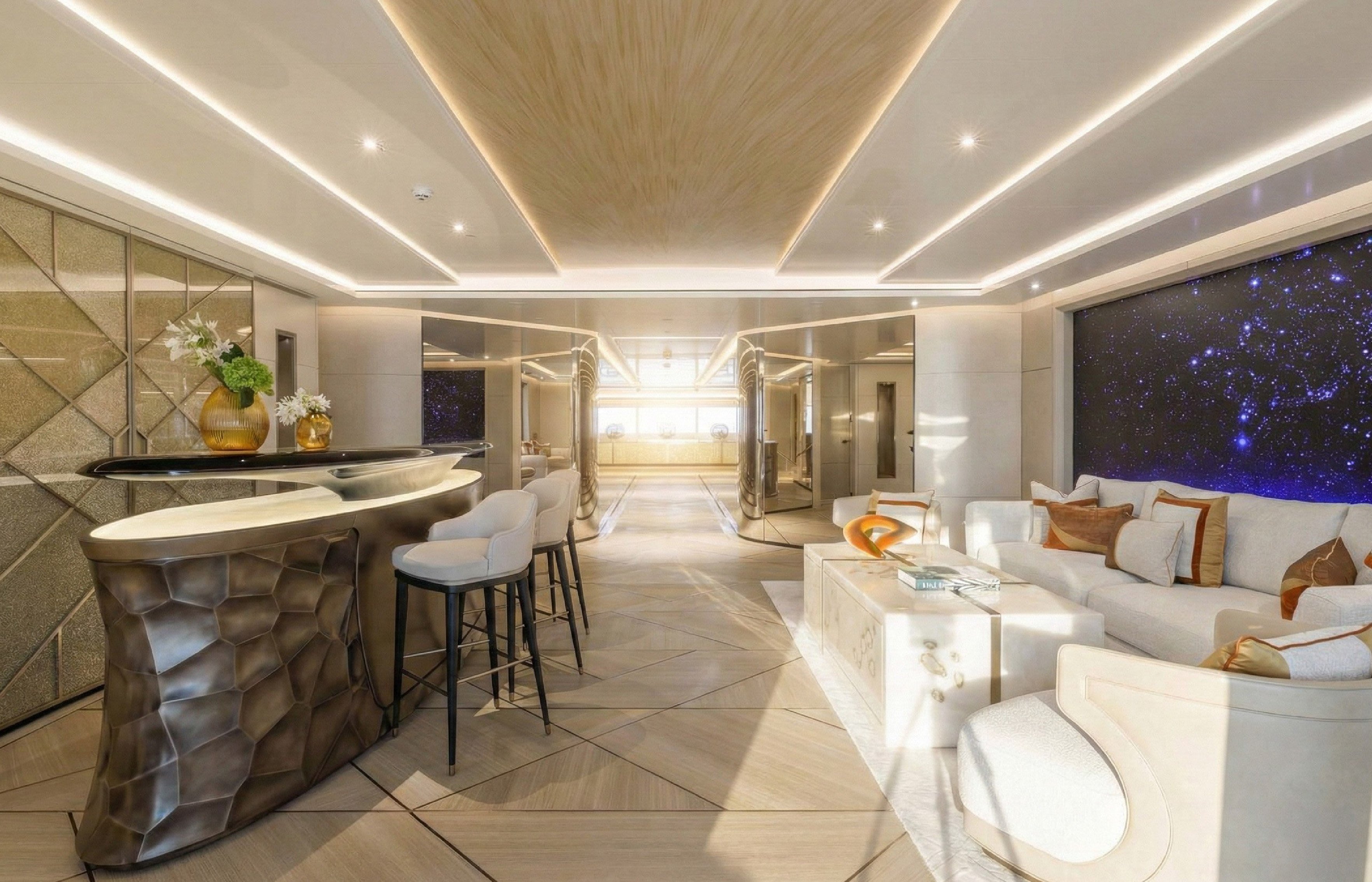 A climate-controlled winter garden with retractable glass walls can accommodate up to 32 guests for dining, making it ideal for corporate charters and shoreside events. The main deck features interactive video walls for dynamic displays and a dual staircase wrapping around a waterfall feature, plus a welcome lobby and bar area.