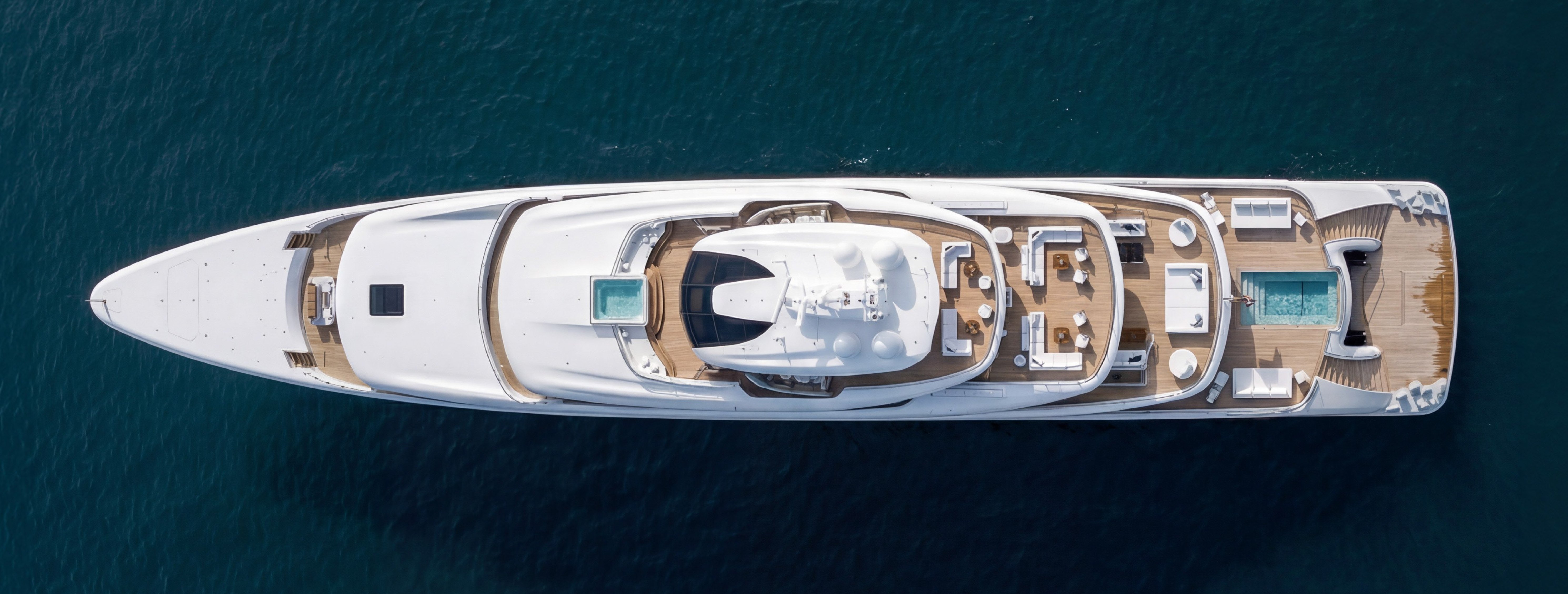 ”H3” accommodates 20 guests in 10 cabins and 32 crew members. The forward-facing master suite on the owner's deck features his-and-hers ensuites, walk-in wardrobes, a private lounge that converts into a cinema and a dining room for 14 guests. The owner's deck also includes a private terrace and direct foredeck access.