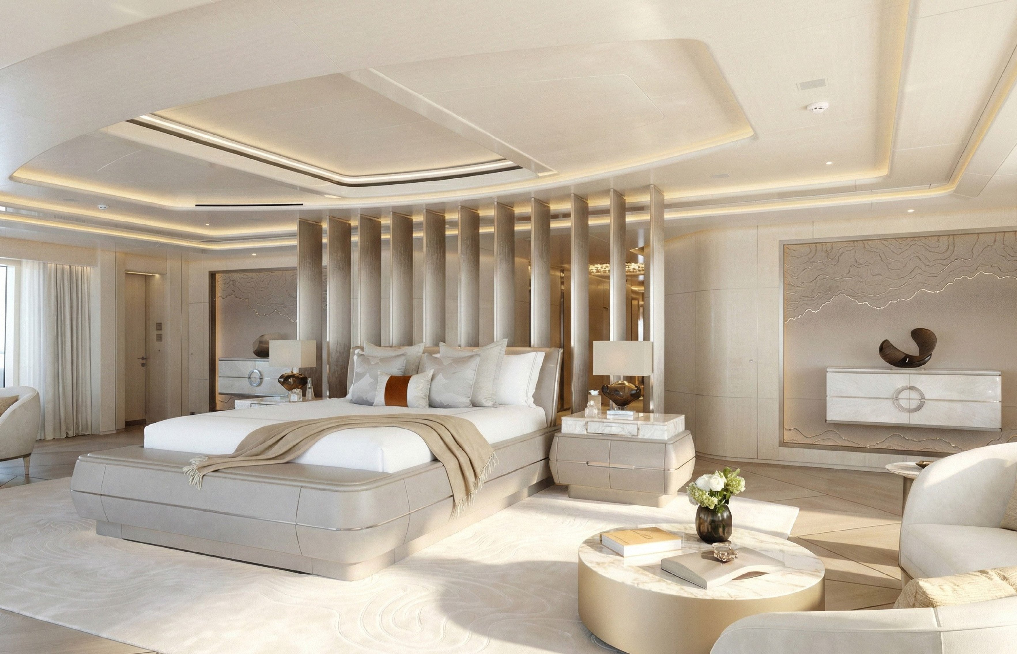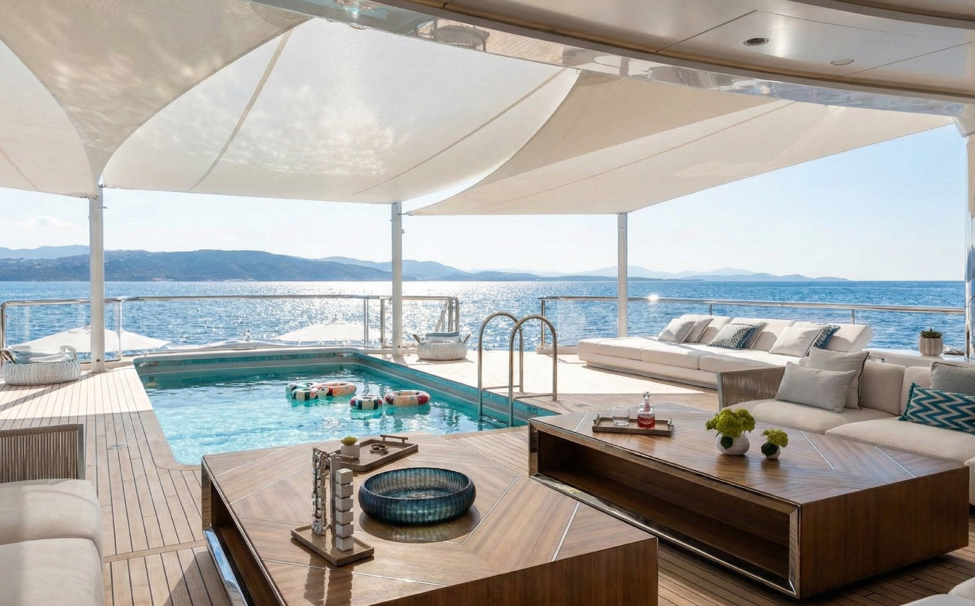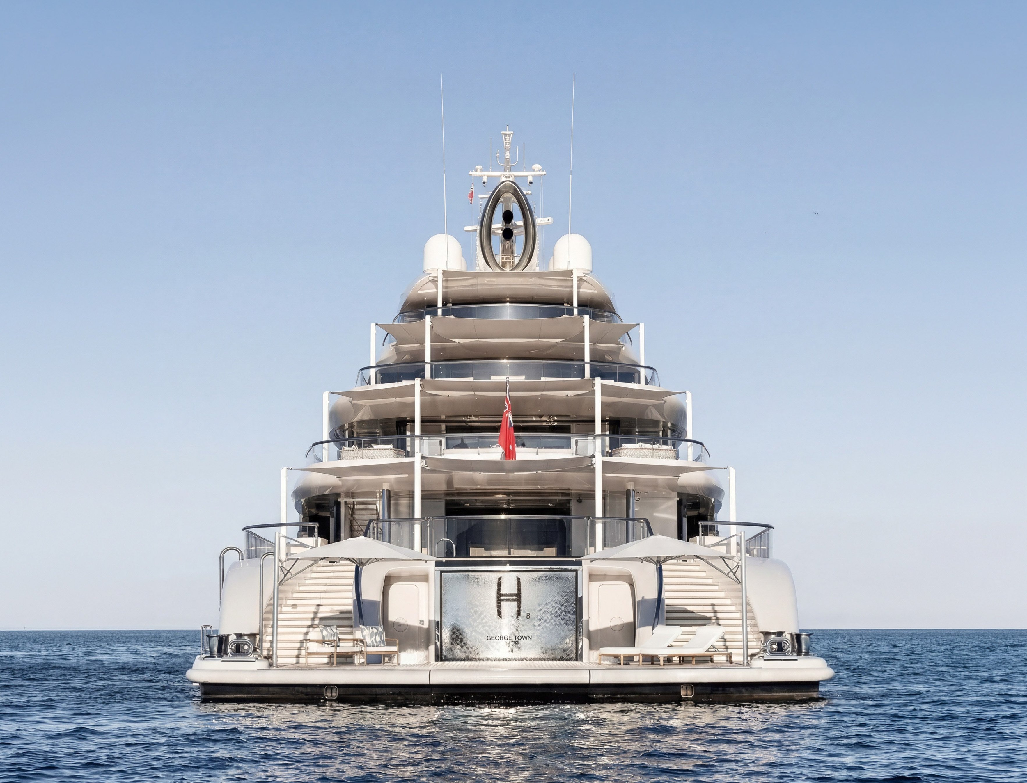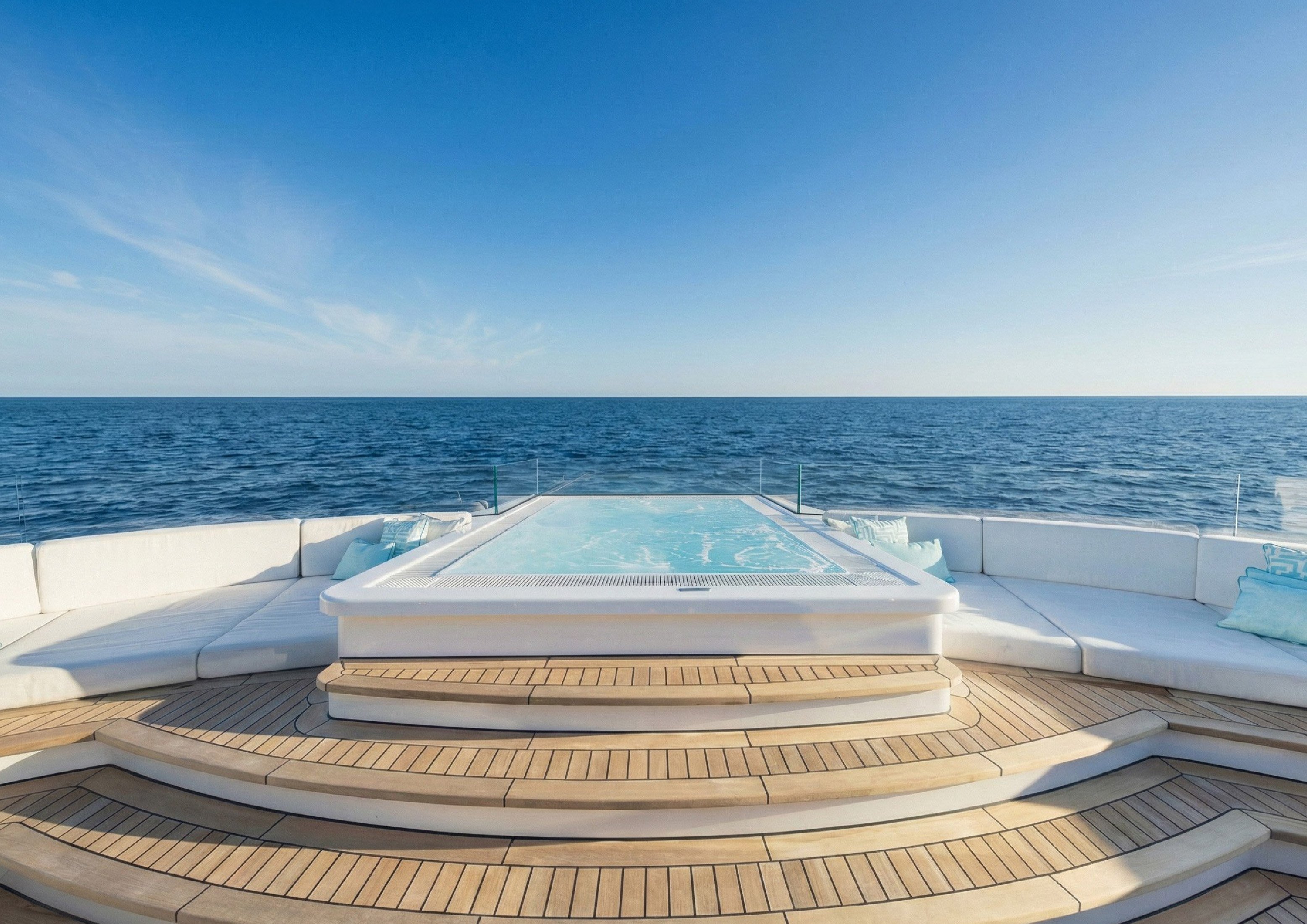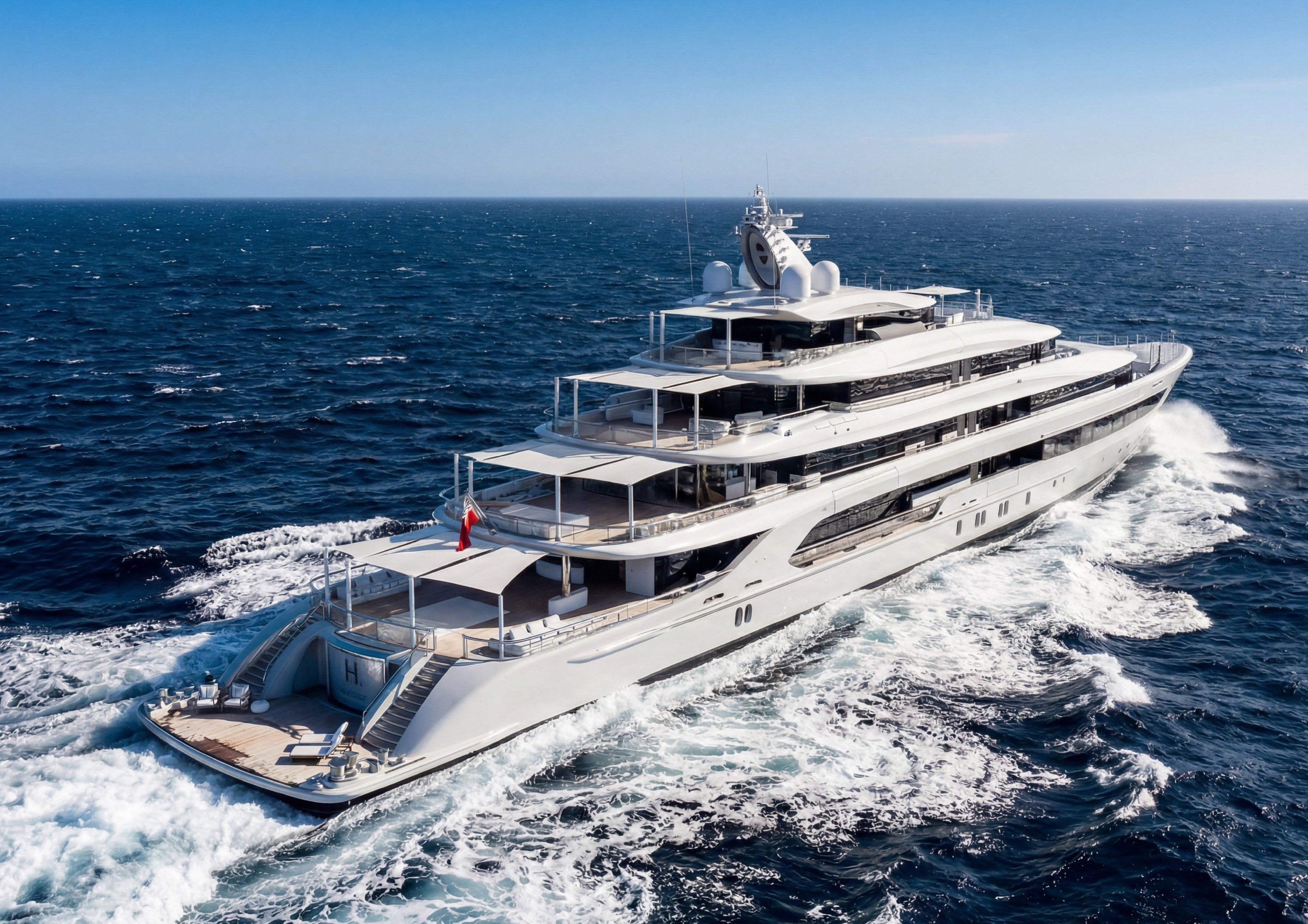 The main deck hosts an adjustable-depth infinity pool with a convertible flush deck that can transform into a dance floor for events, complete with a waterfall feature spilling over the polished chrome ‘H3’ nameplate. The sun deck features a forward-facing whirlpool with panoramic views, along with a bar and lounge areas. The lower deck aft houses an extensive beach club with a fold-down swim platform for water access.