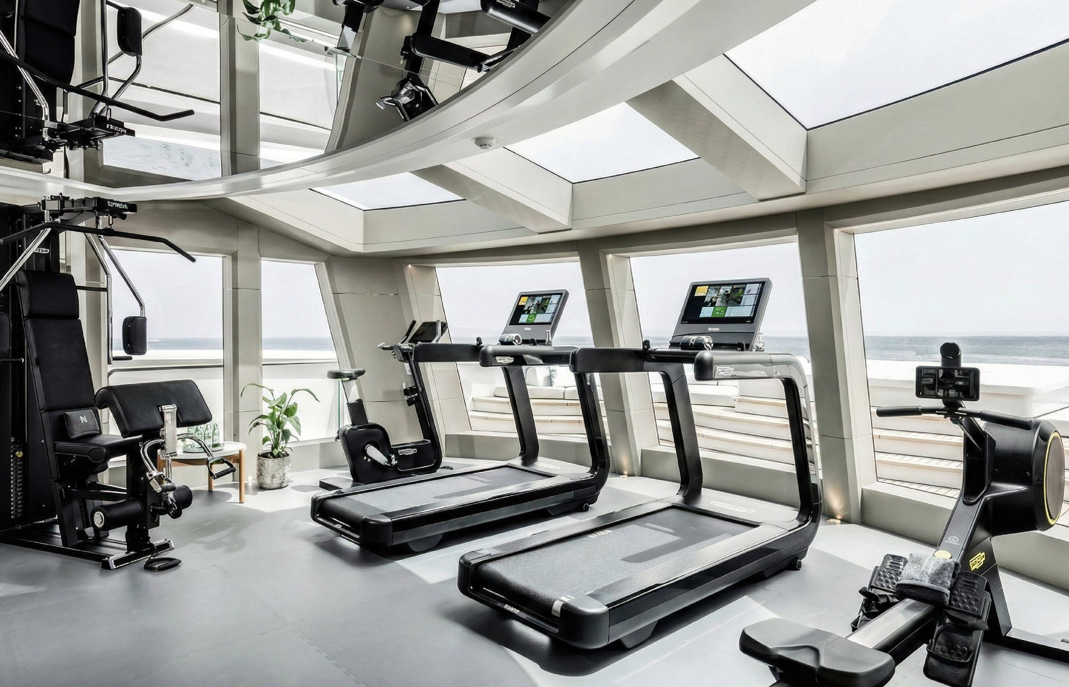 The lower deck is dedicated to wellness, featuring a comprehensive spa area with a hammam, massage room, sensory shower, beauty salon, nail and hair salon. The sun deck includes a fully equipped gym with panoramic views.