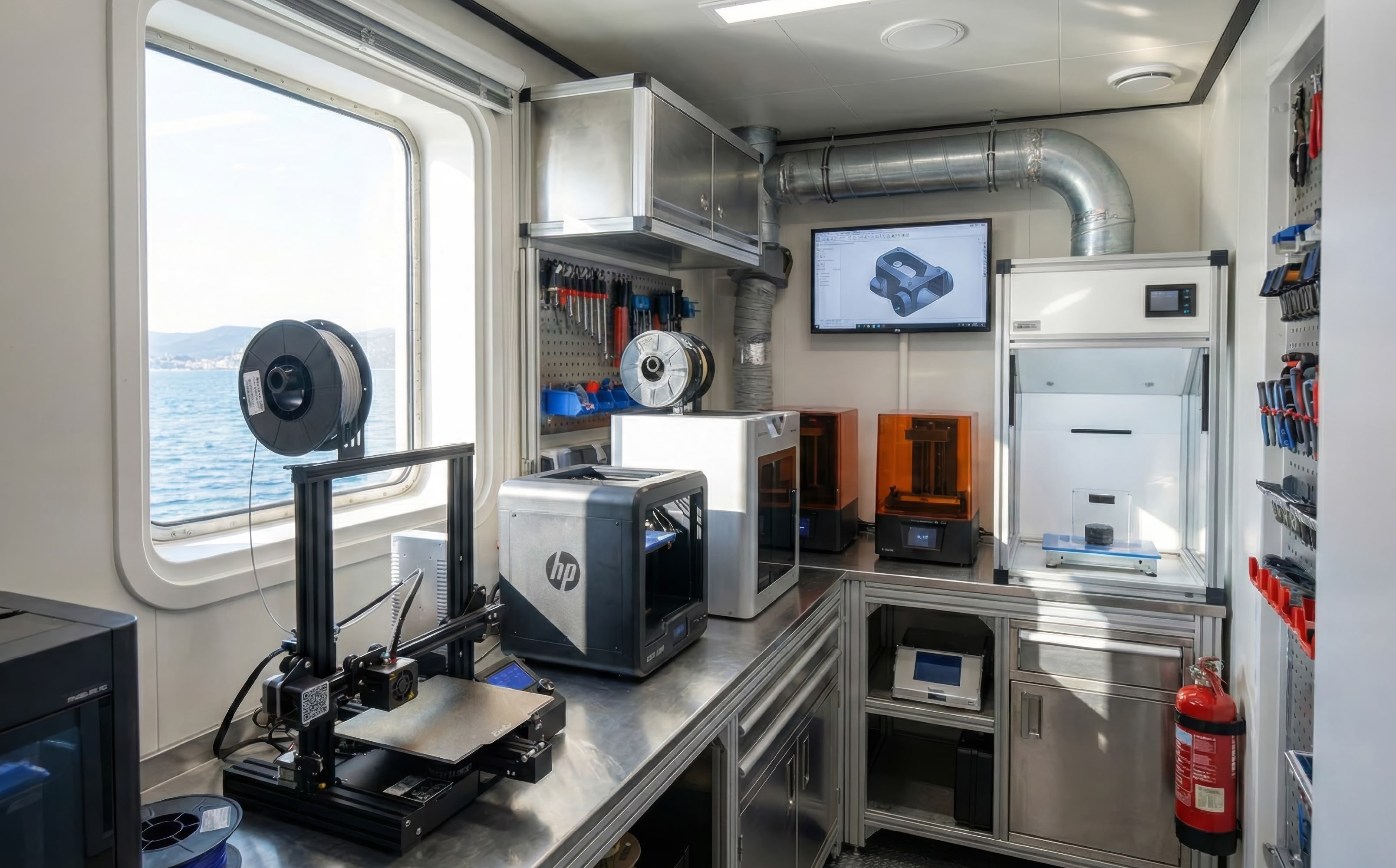 3D PRINTING WORKSHOP: A dedicated fabrication shop allows the crew to print spare parts or prototype research tools on the fly, increasing the vessel's autonomy in remote regions.