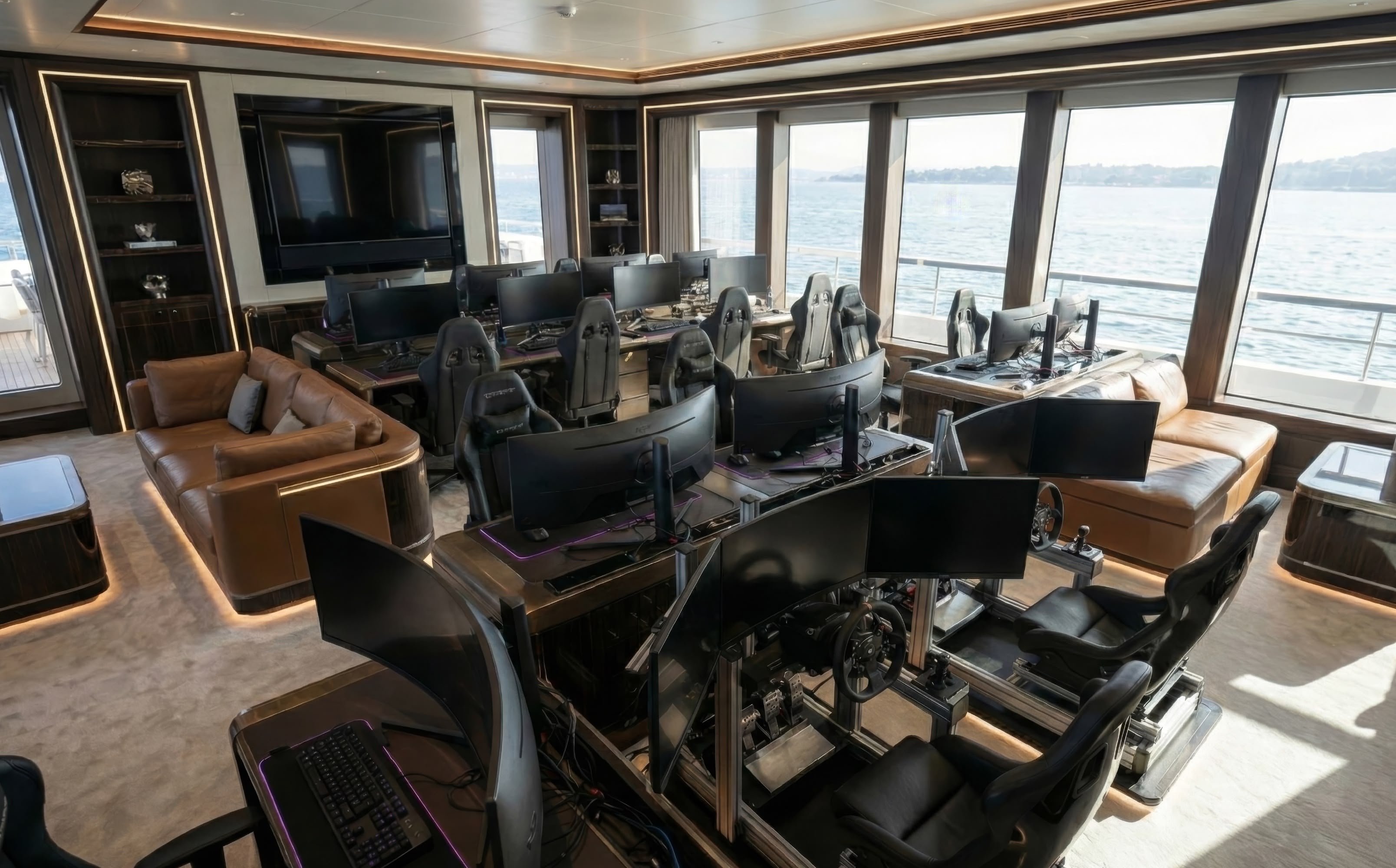 THE GAMING LOUNGE: In a nod to the owner’s professional legacy, the Bridge Deck, typically reserved for a formal lounge/saloon, houses a dedicated Gaming Lounge. The room is equipped with 15 high-performance PC gaming stations and two professional racing simulators. This is likely the most advanced LAN party setup on the high seas. It serves as a primary social hub, allowing for competitive gaming tournaments involving guests and potentially crew.