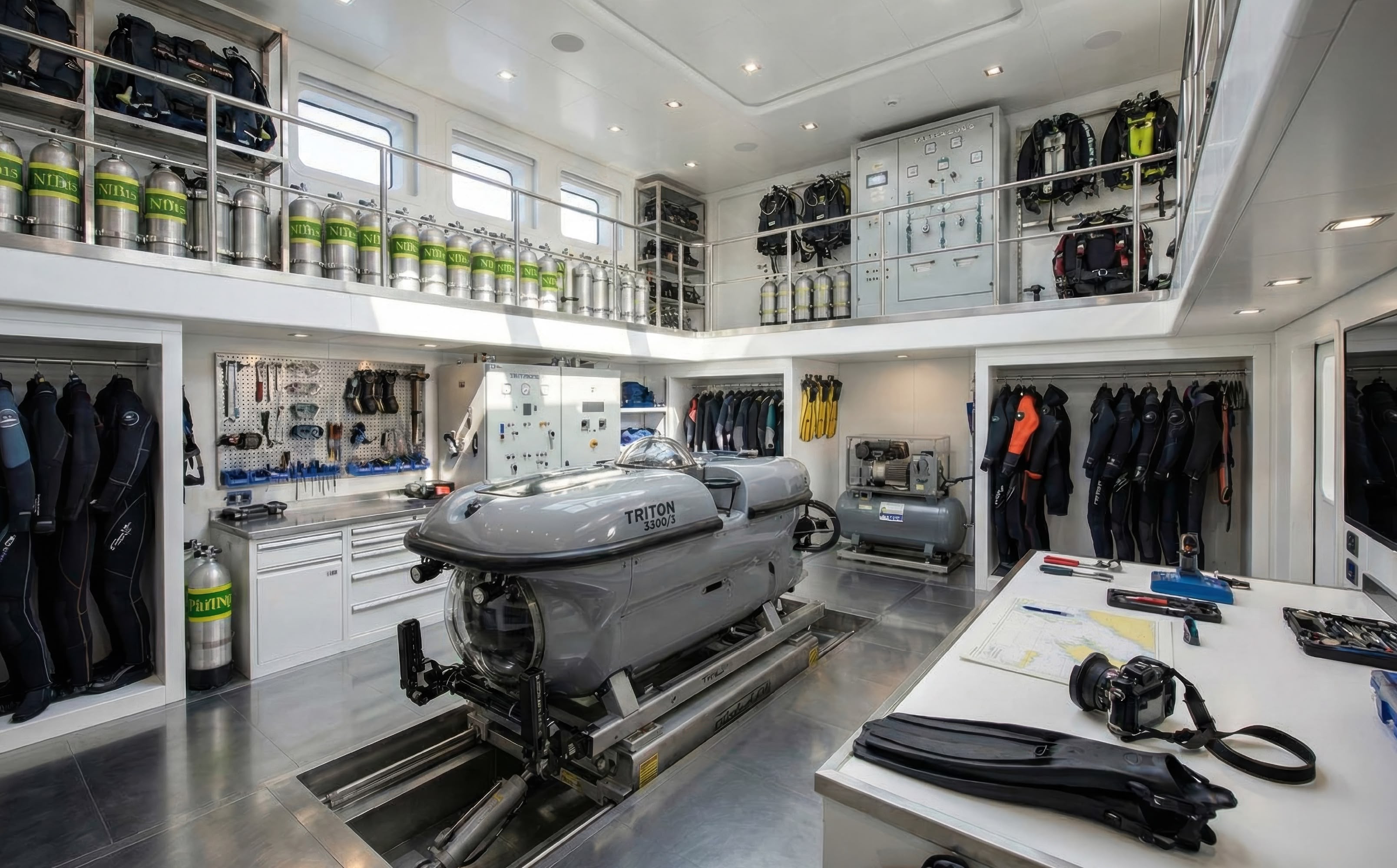 DIVE CENTER: A fully equipped dive center supports both recreational diving and technical deep-sea exploration.