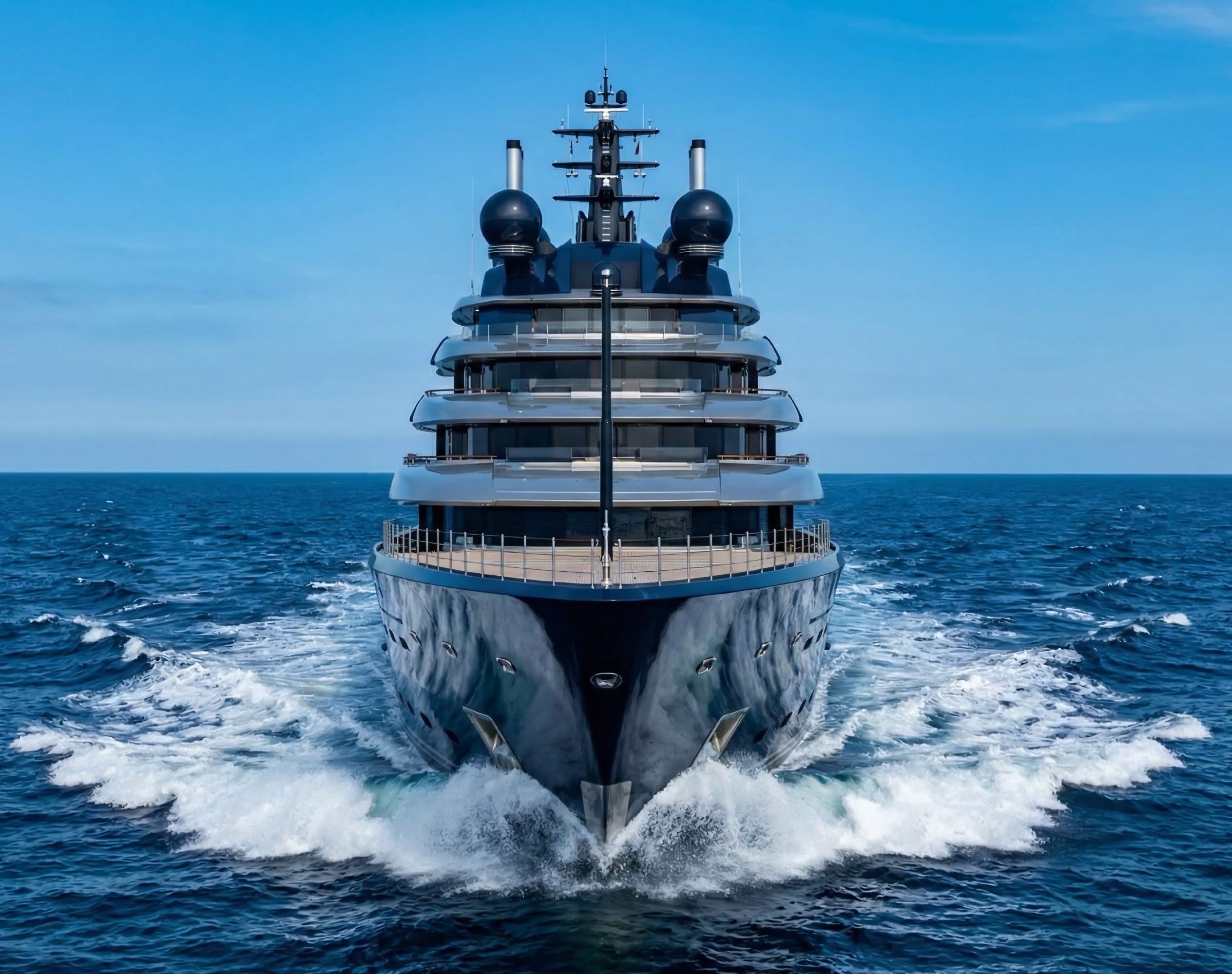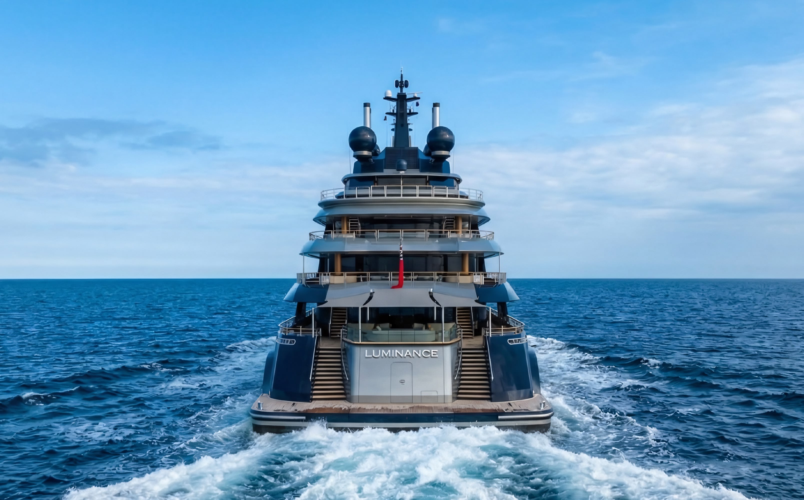 Øino's design for “LUMINANCE” features a striking elongated bow, cascading aft decks, and a distinctive dark blue hull paired with silver accents, creating what observers describe as an assertive and sophisticated appearance.