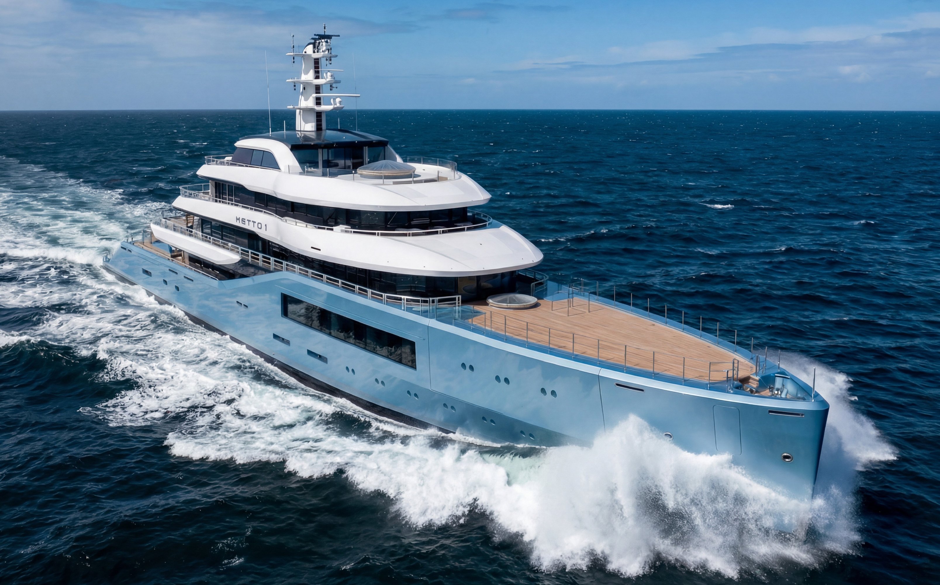 When “NETTO II” emerged from the sheds in Vlissingen in February 2026, she turned heads immediately. Unlike her sister-ship “PENGEA” (hull #1), which sports a more conventional look, “NETTO II” wears a custom ‘dolphin blue’ metallic hull with a platinum bootstripe and white superstructure.